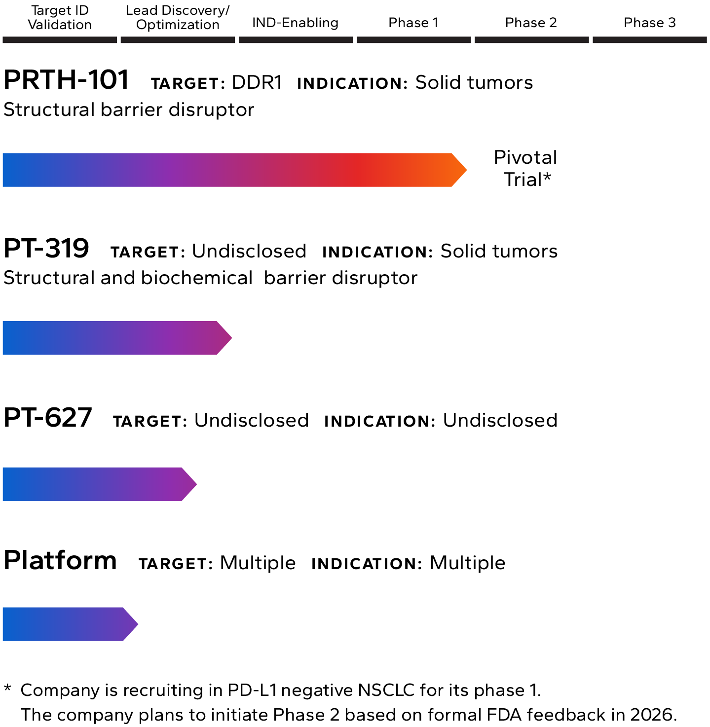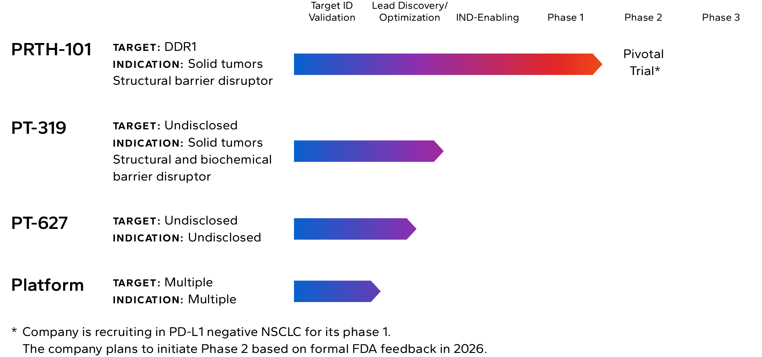 The Company is currently recruiting patients into a Phase 1c clinical trial with PRTH-101 alone and in combination with PD-1 inhibition for the treatment of patients with PD-L1 negative NSCLC and ICI refractory thymic carcinoma (NCT05753722). The company intends to start Phase 2 in 2026.